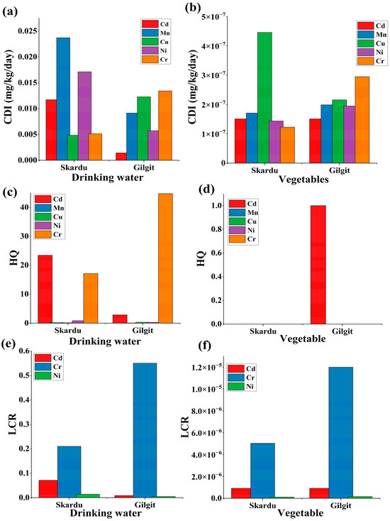 Risk assessment of heavy metals in various samples. (a) Chronic daily intake of toxic metals from drinking water. (b) Chronic daily intake of toxic metals from vegetables. (c) Hazard quotient level exceeded for Cr and Cd in water samples in Gilgit and Skardu. (d) Hazard quotient level of Cd in the vegetable sample from Gilgit. (e) LCR was higher for Cr, Cd, and Ni in drinking water from both regions, and (f) LCR from vegetables of both districts was within the allowable limit (>1 × 10−4).