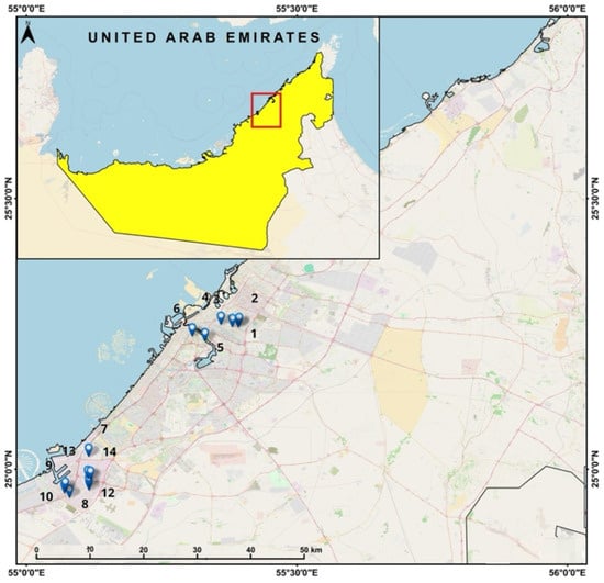 The dust from the desert regions (Sahara in Africa, the Middle East and Arabian Peninsula, and Central Asian Deserts) constitutes another significant atmospheric pollution source. Dust is transported long distances by strong winds and can impact air quality and climate far from its origin [24,25,26]. Being located in a desert region with vast areas of sand dunes (particularly in the Rub’ al Khali), the United Arab Emirates (UAE) is one of the countries that experiences dust storms due to the winds (Shamal) that blow from the northwest, especially during the spring and summer [27,28]. Rapid urbanization and infrastructure building also generate large amounts of dust.