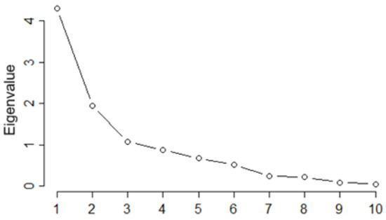 - Catell, R.B. The scree test for the number of factors. Multivar. Behav. Res. 1955, 1, 245–276. [Google Scholar] [CrossRef]
