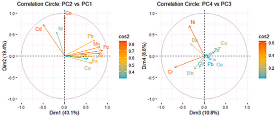 The distance of variables from the origin indicates the quality of their representation on the factor map, with variables farther from the origin being better represented. In Figure 3 and Figure 4 (left), a high cos2 value signifies a good representation of the variable on the PC, placing the variable near the circumference of the correlation circle. Fe, Zn, and Mn are the best represented on PC1 and Co on PC2. Cr and Ni are best represented in the negative direction of PC3, and Ni is best represented on PC4.