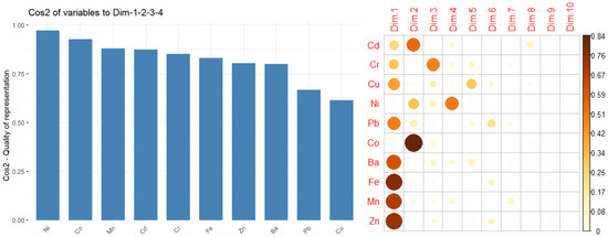 Figure 4 (left) shows the quality of representation of the variables to the first four PCs. Ni, Co, Mn, and Cd, with cos2 values above 0.80 are the best represented. However, Pb and Cu, while still contributing to the explained variance, are worse represented (with cos2 > 0.625).