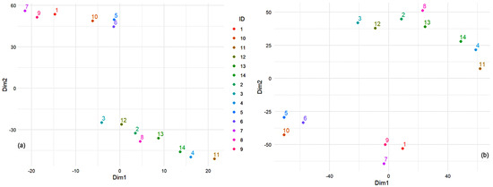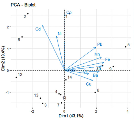 The biplot (Figure 5) summarizes both aspects—the contributions of the variables and individuals. Sites 5 and 9 are best represented on the positive side of PC1, while 12 is best represented on the opposing side. Sites 2 and 1 are best represented on the positive side of PC2, while 3, 7, and 14 are best represented on the negative part.