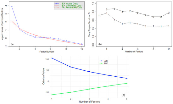 In the FA, by comparing the eigenvalues of the observed data with those obtained from randomly generated data and selecting the factors that satisfy the relation , one can determine which factors explain more variance than would be expected by chance. In VSS, the number of factors (m) that maximize the VSS index is considered optimal [58].