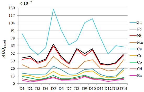 The non-carcinogenic health risk for the population living in the research area was investigated by computing the average daily dose, ADD (mg/kg/day), of each metal, k, by ingestion (), inhalation , and dermal contact (), using (10)–(12) [72,73,74,75].