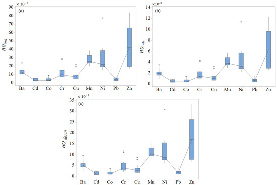 The Hazard Quotients for ingestion, inhalation, and dermal contact for a metal k ( and are computed by: