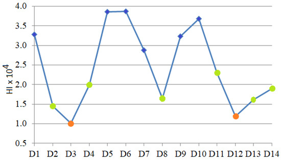 To evaluate the total non-carcinogenic risk for the exposed population, one may use the Hazard Index (HI) obtained by summing up the HQ by all paths for all n metals, so: