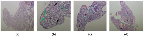 Cellular morphology of liver tissue of juvenile crucian carp after 32 d of stress by PS-MPs: (a) blank control group; (b) low-concentration group; (c) medium-concentration group; (d) high-concentration group (Black arrows indicate cell congestion, red arrows indicate vacuolated cells, green arrows indicate off-center nuclei, and blue arrows indicate enlarged necrotic cells, Picture magnification is 40×).