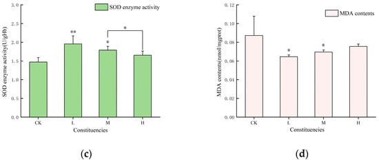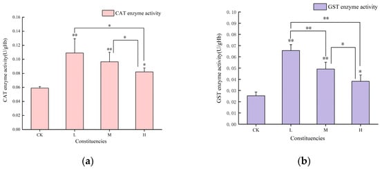 Changes in antioxidant enzymes in liver tissues of juvenile crucian carp after 32 d of exposure to PS-MPs: (a) superoxide dismutase (SOD) activity, (b) glutathione S-transferase (GST) activity, (c) catalase (CAT) activity, (d) malondialdehyde (MDA) content. “*” indicates a significant difference (p < 0.05) and “**” indicates a highly significant difference (p < 0.01).