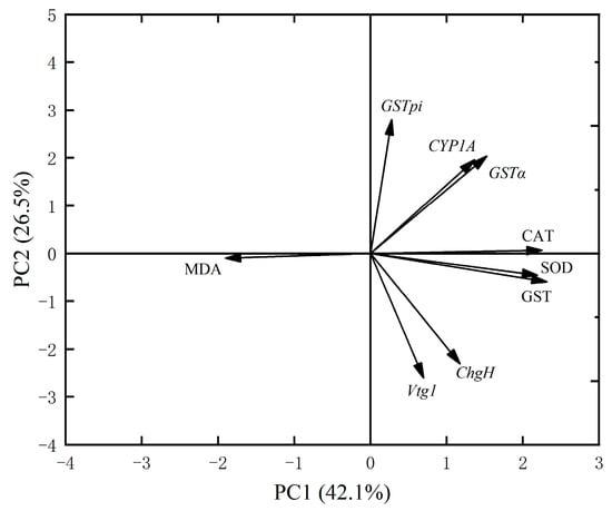 According to the PCA, the cumulative contribution of the first principal component (PC1) and the second principal component (PC2) in the liver was 68.6% (Figure 4); in the PC1 eigenvector, the GSTpi gene and GSTα gene contributed the most and in the PC2 eigenvector, the GST enzyme and CAT enzyme contributed the most, which indicated that juvenile crucian carp liver tissues GSTpi gene, GSTα gene, GST enzyme, and CAT enzyme were most affected by MPs.