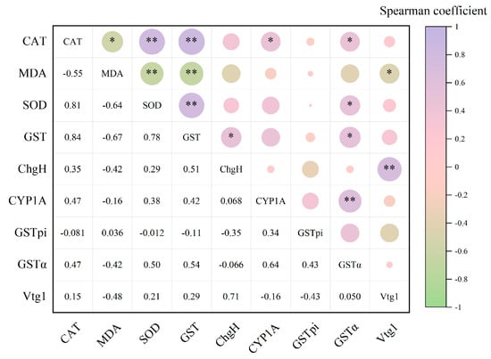 According to Spearman’s correlation analysis, in liver tissues (Figure 5), the CAT enzyme showed a highly significant positive correlation with the SOD enzyme (ρ = 0.81, p < 0.01) and the GST enzyme (ρ = 0.84, p < 0.01), respectively, and a significant positive correlation with the CYP1A gene (ρ = 0.47, p < 0.05) and GSTα gene (ρ = 0.47, p < 0.05) correlation, and significant negative correlation with MDA content (ρ = −0.55, p < 0.05). MDA content showed highly significant negative correlation with the SOD enzyme (ρ = −0.64, p < 0.01) and GST enzyme (ρ = −0.67, p < 0.01) and significant negative correlation with the Vtg1 gene (ρ = −0.48, p < 0.05), respectively. The SOD enzyme showed a highly significant positive correlation with the GST enzyme (ρ = 0.78, p < 0.01) and a significant positive correlation with the GSTα gene (ρ = 0.50, p < 0.05). GST enzymes were significantly and positively correlated with the ChgH gene (ρ = 0.51, p < 0.05) and GSTα gene (ρ = 0.54, p < 0.05), respectively, whereas the ChgH gene showed a highly significant positive correlation with the Vtg1 gene (ρ = 0.71, p < 0.01); the CYP1A gene showed a highly significant positive correlation with the GSTα gene (ρ = 0.64, p < 0.01).