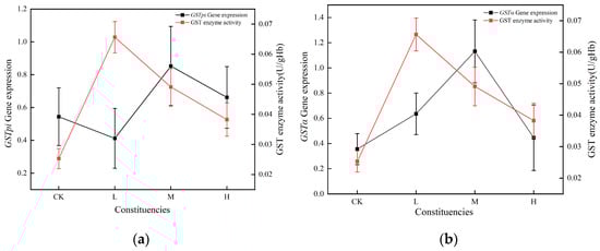 Relationship between antioxidant enzymes and corresponding genes in juvenile crucian carp liver tissues after 32 d of PS-MP exposure: (a) Relationship between GST enzyme activity and GSTpi gene expression; (b) Relationship between GST enzyme activity and GSTα gene expression.