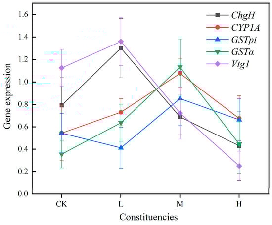 In juvenile crucian carp liver tissues (Figure 7), the trends of CYP1A and GSTα gene expression changes in different concentration groups were consistent, exhibiting a pattern of initial increase and subsequent decrease in expression with rising exposure concentration. Additionally, the expression of GSTpi demonstrated an initial increase and subsequent decrease at elevated concentrations. However, expression in the low-concentration group was lower than that in the blank group. The expression of ChgH and Vtg1 in the various concentration groups exhibited a comparable trend, yet the expression tended to decline with increasing exposure concentration. The expression in the middle- and high-concentration groups was also lower than that in the blank control group.