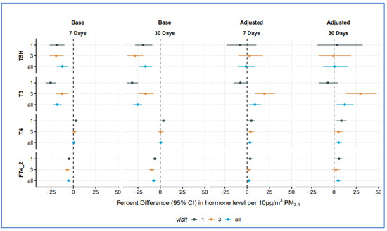 Visit 1 cross-sectional analyses: For TSH and T3, we observed consistent inverse associations in our cross-sectional base models at Visit 1 in both 7-day and 30-day moving average exposures. In fully adjusted models, associations for both TSH (7-day: %-difference −7.8, 95% CI: −23.0, 10.3; 30-day: %-difference 3.8, 95% CI: −18.5, 32.1) and T3 (7-day: %-difference −7.6, 95% CI: −15.2, 0.7; 30-day: %-difference −6.8, 95% CI: −17.0, 4.6) were non-significant. For T4, statistically significant and positive associations were observed in base models, with larger magnitude associations observed in fully adjusted models, where a 10 μg/m3 increase in 7-day moving average PM2.5 exposure was associated with a 4.8% (95% CI: 0.8, 8.9) increase, and a 10 μg/m3 increase in 30-day moving average PM2.5 exposure was associated with an 8.3% (95% CI: 2.8, 14.1) increase. Similar results were observed for FT4 in adjusted models, where a 10 μg/m3 increase in 7-day and 30-day average PM2.5 exposure was associated with a 3.5% (95% CI: 0.2, 6.8) and a 5.6% (95% CI: 1.2, 10.2) increase in FT4, respectively.