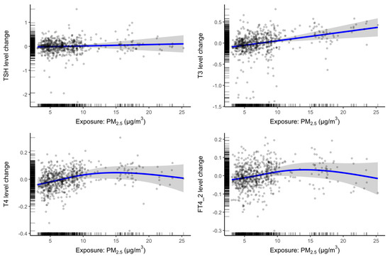 Cubic spline GAMMs of hormone dose responses for all visits at 30-day exposure. Circles are observed thyroid hormone levels; blue line is the estimated thyroid hormone level given the PM2.5 exposure concentration; grey bands are 95% confidence intervals around the estimates.
