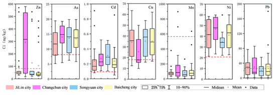 - Jin, P. Research on background value of soil environment in Jilin Province. Jilin Geosci. Technol. Intell. 1993, 3, 13–24. [Google Scholar]