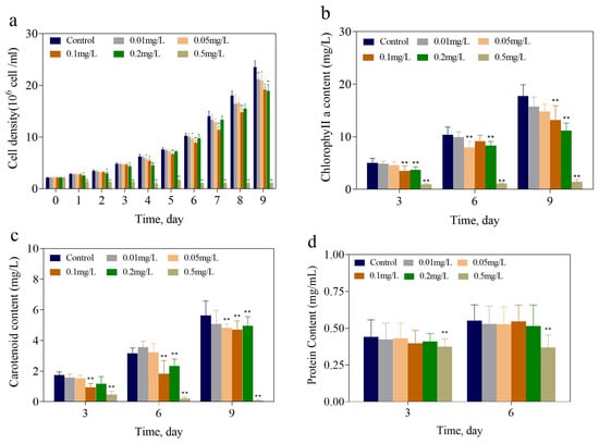 3.1.1. Inhibitions of Growth, Photosynthetic Pigments, and Protein Contents