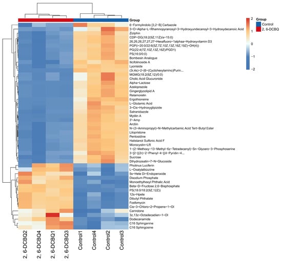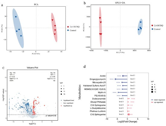Zhang, T.; Wang, Z.; Wu, L.; Liu, C.; Meng, L.; Tian, F.; Hou, M.; Lin, H.; Ye, J. The Effects of Disinfection Byproduct 2,6-Dichloro-1,4-benzoquinone on the Cyanobacterium Microcystis aeruginosa: From the Perspectives of Biochemistry and Non-Targeted Metabolomics. Toxics 2025, 13, 64. https://doi.org/10.3390/toxics13010064
