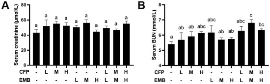 The effect of CFP and EMB on kidney function. SD rats received orally administered CFP at doses of 1, 3, and 9 mg/kg/day and/or EMB at doses of 0.2, 0.6, and 1.8 mg/kg/day for 60 consecutive days. Serum samples were collected after the 60-day exposure and the levels of creatinine (A) and blood urea nitrogen (B) in serum were measured. Data are presented as mean ± SEM (n = 4). Statistical significance among groups was evaluated using one-way ANOVA, followed by Duncan’s multiple-range test. Different letters indicate significant differences between the groups (p < 0.05), while the same letters indicate no significant difference (p > 0.05). Abbreviations: CFP, chlorfenapyr; EMB, emamectin benzoate; BUN, blood urea nitrogen; L, low dose; M, medium dose; H, high dose.