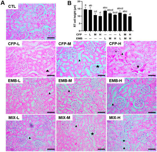 CFP and EMB induce pathological damage in the kidneys of rats. SD rats were treated orally with CFP at doses of 1, 3, and 9 mg/kg/day and/or EMB at doses of 0.2, 0.6, and 1.8 mg/kg/day for 60 consecutive days. Kidney samples were collected after the 60-day treatment. (A) Kidney tissue sections were stained by H&E. Scale bar: 100 µm. The triangle indicates thinned renal tubular epithelial cells, and the pentagram indicates an abnormal glomerular morphology. (B) Quantitative renal tubule (RT) cell height analysis was calculated by Image J (Version 1.48). Data are presented as mean ± SEM. Statistical significance among groups was assessed using one-way ANOVA followed by Duncan’s multiple-range test. Different letters indicate significant differences between the groups (p < 0.05), while the same letters represent no significant difference (p > 0.05). Abbreviations: RT, renal tubule; CFP, chlorfenapyr; EMB, emamectin benzoate; MIX, CFP plus EMB; L, low dose; M, medium dose; H, high dose.