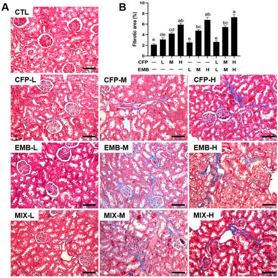CFP and EMB exposure resulted in fibrosis in the kidneys of rats. SD rats were orally treated with CFP at doses of 1, 3, and 9 mg/kg/day and/or EMB at doses of 0.2, 0.6, and 1.8 mg/kg/day for 60 days. Kidney samples were collected at the end of the 60-day administration. (A) Kidney tissue sections were stained by Masson’s trichrome method. Scale bar: 100 µm. (B) Quantitative analysis of fibrotic area was calculated by Image J (Version 1.48). Data are expressed as mean ± SEM. Statistical significance among groups was evaluated by one-way ANOVA followed by Duncan’s multiple range test. Different letters indicate a significant difference between the groups (p < 0.05), while the same letters indicate no significant difference (p > 0.05). Abbreviations: CFP, chlorfenapyr; EMB, emamectin benzoate; MIX, CFP plus EMB; L, low dose; M, medium dose; H, high dose.