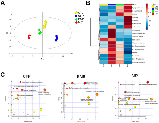 CFP and EMB administration changed kidney metabolic profiles. SD rats were orally treated with CFP at doses of 1, 3, and 9 mg/kg/day and/or EMB at doses of 0.2, 0.6, and 1.8 mg/kg/day. After 60 consecutive days of exposure, kidney samples were collected, and metabolites were analyzed by using the GC-MS method. (A) PLS-DA score plots of kidney metabolite profiles of the rats following exposure of CFP (1 mg/kg/day) and/or EMB (0.2 mg/kg/day). (B) Hierarchically clustered heatmap of the 18 significantly altered metabolites. (C) Significantly affected metabolic pathways. Abbreviations: CTL, control; CFP, chlorfenapyr; EMB, emamectin benzoate; MIX, CFP plus EMB.