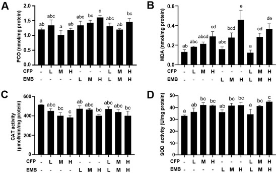 CFP and EMB administration caused renal oxidative stress in rats. SD rats were orally treated for 60 consecutive days with CFP at doses of 1, 3, and 9 mg/kg/day and/or EMB at doses of 0.2, 0.6, and 1.8 mg/kg/day. After exposure, kidney samples were collected, and then the levels of PCO (A) and MDA (B) and the activities of CAT (C) and SOD (D) were measured. Data are presented as mean ± SEM (n = 3–4). Statistical significance among groups was evaluated by one-way ANOVA followed by Duncan’s multiple-range test. Different letters indicate a significant difference between the groups (p < 0.05), while the same letters indicate no significant difference between the groups (p > 0.05). Abbreviations: CFP, chlorfenapyr; EMB, emamectin benzoate; PCO, protein carbonyls; MDA, malondialdehyde; CAT, catalase; SOD, superoxide dismutase; L, low dose; M, medium dose; H, high dose.