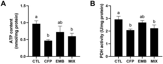 To understand whether CFP disturbed energy metabolism, we examined ATP content in the kidneys. The results showed that CFP or a mixture of CFP and EMB reduced ATP content, while EMB had no effect on that (Figure 6A). In addition, we measured PDH activity, which was a key enzyme during glucose metabolism and played a crucial role in ATP production. We found that the activity of PDH was inhibited by CFP, which was consistent with the changes in ATP content (Figure 6B). The above results suggested that CFP disrupted energy metabolism in the kidneys.