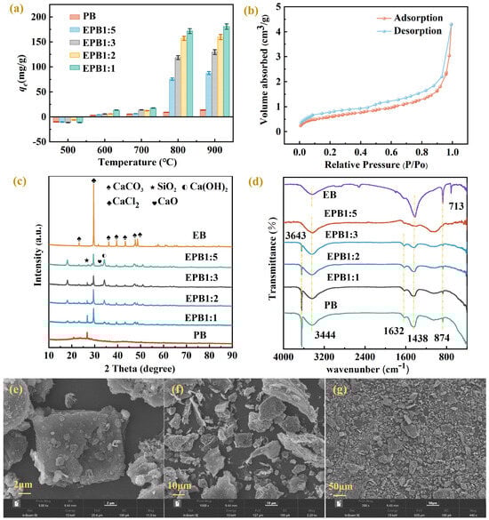 EPB1:5 characterization. (a–c) Scanning electron microscopy (SEM) images of the outside surface. (d) N2 adsorption/desorption isotherms. (e) The influence of preparation temperature and eggshell addition amount on the adsorption capacity of EPB1:5. (f) X−ray diffraction (XRD) patterns of biochar. (g) Fourier−transform infrared spectroscopy (FTIR) of biochar.