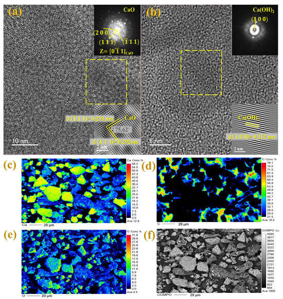 Furthermore, the characteristics of calcium-based biochar were explored using XRD, FTIR, TEM, and EPMA. XRD analysis showed that PB and each calcium-based biochar showed typical peaks (2θ = 22.83°) of a graphite carbon crystal plane (002) (Figure 1c), with the calcium-based biochars showing similar compositions. Additionally, the diffraction peak of EPB1:1 biochar at 29.40° corresponded to CaCl2 (PDF: 74–0992); 32.20° corresponded to CaO (PDF: 37–1497); 35.97°, 39.40°, 43.15°, 47.12°, and 48.51° corresponded to CaCO3 (PDF: 05–0586); and 18.07° and 34.10° corresponded to Ca(OH)2 (PDF: 44–1481) [35]. XRD analysis showed that CaO and Ca(OH)2 were present in eggshell-derived biochar, which was consistent with previous findings [36]. Calcium oxide may be produced by the pyrolysis of calcium carbonate in eggshells. Additionally, some calcium oxide can also produce Ca(OH)2 with water in the environment [31]. Moreover, the infrared spectra of each biochar and calcium-based biochar at approximately 3643 cm−1 could be attributed to the tensile vibration of -OH (Figure 1d), which may be related to the presence of Ca(OH)2 [7]. Additionally, the peaks at 1438, 874, and 713 cm−1 may be attributed to calcium carbonate tensile vibration [37]. Overall, these results confirm the successful introduction of calcium from eggshells into biochar in the form of calcium oxide and calcium hydroxide. As shown in Figure 2a,b, the lattice spacing of 0.292 and 0.312 nm in the TEM spectra corresponded to the 100 crystal planes of CaO and 111 of Ca(OH)2, respectively, indicating that CaO and Ca(OH)2 particles were successfully embedded in the biochar. Additionally, the EPMA further confirmed that the charcoal was tightly wrapped by CaO and Ca(OH)2 particles (Figure 2c–f). SEM showed that the surface topography of EPB1:1 was irregular and lumpy (Figure 1e–g). BET analysis was performed to examine the specific surface area, pore size, and pore distribution of each calcium-based biochar (thermal decomposition temperature: 800 °C) (Table 2). Notably, the specific surface area and average pore size of calcium-based biochar showed a gradual decrease with increasing addition of eggshells, which was contrary to the findings of Liu et al. [36]. The differences in results could be attributed to differences in the properties of biochar materials. For example, the specific surface area of peanut shell biochar (94.30 m2/g) used in this study was larger than that of straw biochar (specific surface area: 7.82 m2/g) used in the previous study [38]. Additionally, the CaO generated by the high-temperature pyrolysis process of CaCO3 may clog the voids of biochar. Therefore, the specific surface area and average pore size of calcium-based biochar may decrease gradually with increased addition of eggshells. According to the IUPAC classification, the N2 isothermal desorption curve of EPB1:1 was a type IV isotherm (Figure 1b), and the average pore size of EPB1:1 was 12.13 nm, making it a potential mesoporous adsorbent. Additionally, the calculation of the grain size of each calcium-based biochar further indicates that the grain size of each calcium-based biochar decreased gradually with increasing addition of eggshell, which may be due to the co-pyrolysis of eggshells and peanut shells to form fine second-phase particles (CaO), thereby preventing further grain growth through Zener pinning [39].