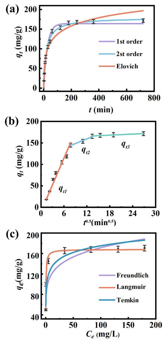 (a) Adsorption kinetics fitted using pseudo-first-order, pseudo-second-order, and Elovich models; (b) intraparticle diffusion model. (c) Adsorption isotherms fitted using Langmuir, Freundlich, Langmuir–Freundlich, and Temkin models.