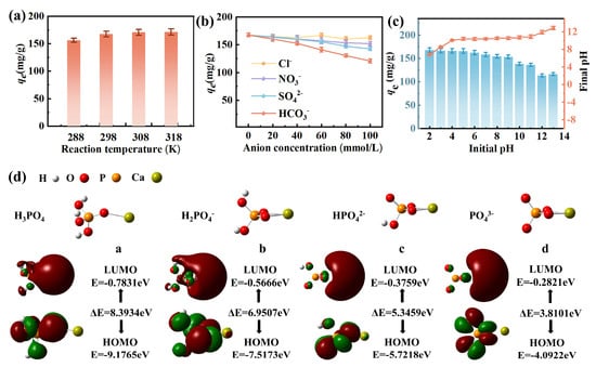 Effects of temperature (a), ion type (b), and initial pH (c) on the adsorption characteristics of phosphate by EPB1:1. Density functional theory (DFT) calculations of different forms of phosphate and Ca ions (d).