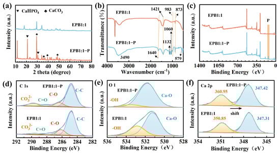 XRD (a), FTIR (b), XPS total spectra (c), C1s (d), O1s (e), and Ca2p (f) of EPB1:1 and EPB1:1-P.