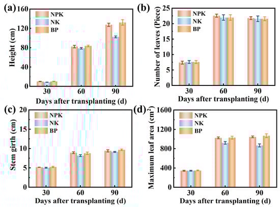 Effects of different fertilization measures on plant height (a), effective leaf number (b), stem circumference (c), and maximum leaf area (d) in tobacco plants.