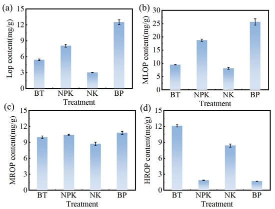 The effects of different fertilization measures on (a) labile organic phosphorus (LOP), (b) moderately labile organic phosphorus (MLOP), (c) moderately resistant organic phosphorus (MROP), and (d) highly resistant organic phosphorus (HROP) in tobacco soil.