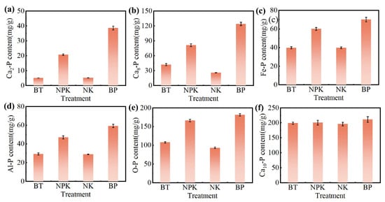 Changes in inorganic phosphorus components under different fertilization treatments are shown in Figure 8a–f. Among the fractions, Ca2-p was identified as the most effective source of phosphorus. Ca2-p increased by 3.06- and 6.59-fold in the NPK and BP groups, respectively, compared with that in the BT group, which can be attributed to the rapid release of active phosphorus following EPB1:1-P application [53]. Ca8-P is considered a slow-release phosphorus source in soil. NPK and BP treatments increased Ca8-P content by 0.93- and 1.94-fold, respectively, compared with BT treatment. This may be due to the fact that the potassium dihydrogen phosphate and EPB1:1-P added by NPK and BP treatments contained p and Ca, thereby increasing Ca8-P content [54]. Al-P and Fe-P are the slow-release phosphorus sources of soil phosphorus components. Al-P and Fe-P contents increased by 26.23 and 16.60%, respectively, in the BP group compared with those in the NPK group, which may be because EPB1:1 dissolves some hydroxide in the soil solution and raises the soil pH, thereby promoting the adsorption of metal ions by the negatively charged colloid and promoting the formation of Al-P and Fe-P [55,56]. O-P is considered a fixed source of phosphorus in soil, with low activity and difficult to utilize. Compared with that in the BT group, there was an increase in soil O-P content in the NPK and BP groups. Ca10-P is a fixed source of phosphorus, mainly composed of certain inorganic insoluble minerals. Generally, biochar addition promoted the conversion of Ca10-P to a more active form and enhanced its dissolution by increasing microbial or phosphatase activity, although there were minor variations among the biochar groups [57].