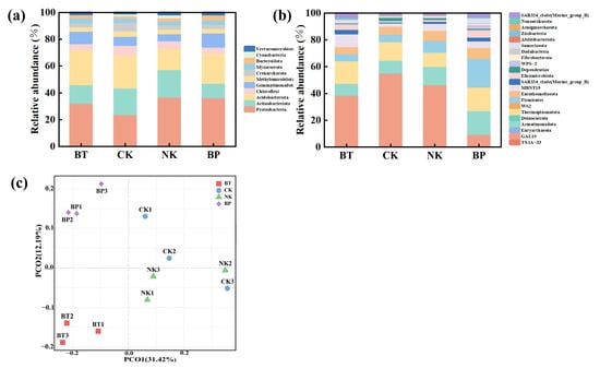 The α-diversity index is an important indicator used to quantify the number and relative abundance of species within a community. The Simpson, Shannon, and Chao 1 indices were used to analyze α-diversity. The Simpson index reflects community evenness, while the Shannon and Chao 1 indices assess community diversity [58]. As shown in Table S5, the Chao 1, Shannon, and Simpson indices of the NK, NPK, and BP groups were higher than or equal to those in the BT group. Notably, the Shannon index was highest in the BP group, suggesting that EPB application positively affected the richness and diversity of microbial communities in the tobacco rhizosphere. β-diversity describes the differences in species composition between different communities, and is usually visualized using principal coordinate analysis (PCoA) to reduce the dimensionality of complex microbial data. PCoA shows that the BP samples formed a distinct cluster from the NPK and NK samples (Figure 9c), indicating a significant difference in microbial community structure under different fertilization conditions. Previous studies have shown that an increase in soil carbon positively affects the soil microbial community diversity. Similarly, EPB1:1-P application significantly altered the soil microbial community composition and diversity, which may be due to an increase in soil carbon content and the growth and reproduction of soil microorganisms [59].