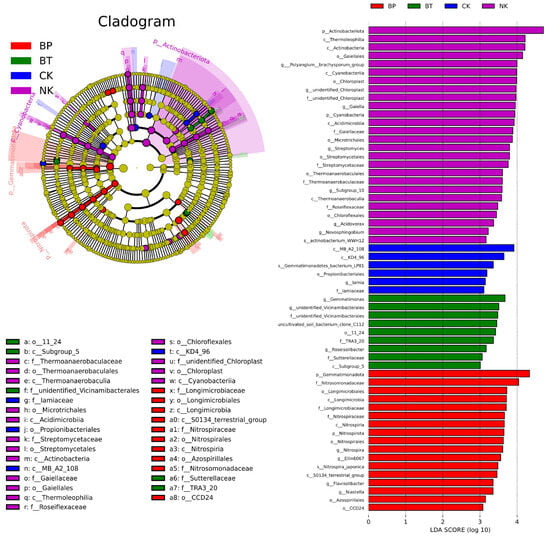 At the phylum level, 13, 11, 11, 11, and 9 phyla were dominant (abundance > 1%) in the BT, NPK, BK, and BP groups (Figure 9a). Notably, the most dominant phyla in the BT group before tobacco cultivation were Proteobacteria (25.46%), Acidobacteriota (27.01%), Actinobacteriota (12.80%), and Gemmatimonadota (8.36%) (Figure 9b). A similar trend was observed in the NPK, BK, and BP groups after tobacco cultivation. Specifically, Chloroflexi (4.166.94) replaced Gemmatimonadota as the fourth most abundant phylum, indicating that these four genera may be highly competitive or have specific ecological adaptability under tobacco cultivation ecological environmental conditions, which was consistent with the findings of Wenjing Wang [60]. Compared with those in the NPK group, there was a significant decrease in Cyanobacteria and Verrucomicrobiota abundances and a 49.29% increase in Proteobacteria abundance after the addition of phosphorus-rich biochar. Overall, these results indicate that EPB1:1-P significantly affects the microbial community structure of the tobacco rhizosphere. Proteobacteria are essential for the global carbon, nitrogen, and sulfur cycles, while proteobacteria enrichment can reduce bacterial wilt [61]. EPB1:1-P application indirectly enhanced the resistance of tobacco to bacterial wilt by increasing the abundance of Proteobacteriaceae. At the genus level, the genus with the highest abundance in all treatments was Sphingomonas. Compared with that of BT, the other three treatments showed significant changes in microbial community at the genus level. Specifically, Subgroup_10, Dongia, and Allorhizobium–Neorhizobium–Pararhizobium–Rhizobium all increased to varying degrees. Additionally, Nitrospira abundance increased significantly from 0.64% in the NPK group to 1.35% in the BP group. Nitrospira abundance was similar in the NPK and NK groups. Nitrospira, a genus of bacteria active in the soil nitrogen cycle, converts nitrates to nitrites, promoting plant growth, which may be responsible for the increased soil nitrate nitrogen content in the BP group. Additionally, soil nitrate nitrogen can increase plant resistance to diseases, such as root rot and bacterial wilt [61]. The main reason is that soil nitrates can promote the induce the activation of signal transduction components such as salicylic acid and polyamines. Therefore, EPB1:1 addition may have increased the abundance of antagonist and nitrogen cycling bacteria, thereby increasing the disease resistance of tobacco and reducing the incidence of diseases, which is beneficial to tobacco growth.