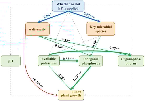 Structural equation analysis of the effect of adding EPB on the growth and development of tobacco plants (“*”: Indicates p ≤ 0.05; “**”: Indicates p ≤ 0.01; “***”: Indicates p ≤ 0.001).