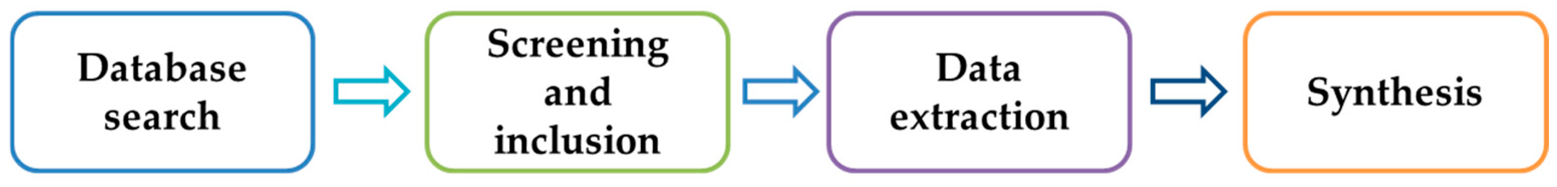 The literature search and selection process for this review was conducted in a systematic manner to ensure comprehensiveness, reproducibility, and minimal bias. The methodology primarily involved four stages: (1) database search; (2) screening and inclusion; (3) data extraction; and (4) synthesis. The overall workflow is schematically summarized in Figure 2.