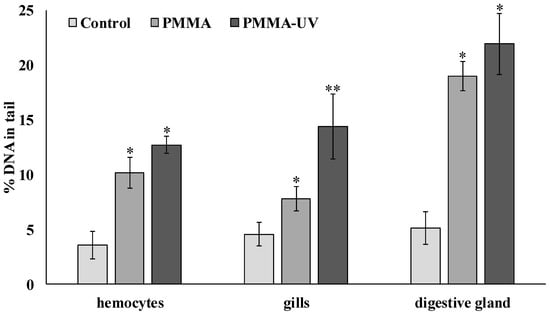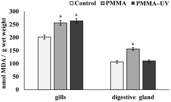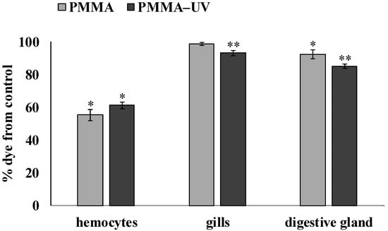 - Both PMMA and UV-aged PMMA reduce lysosomal membrane stability, causing oxidative stress in the gills, while only PMMA induces oxidative stress in the digestive gland.