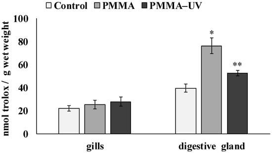 - Biochemical responses were tissue-specific, with antioxidant activity increasing mainly in digestive gland cells exposed to PMMA.