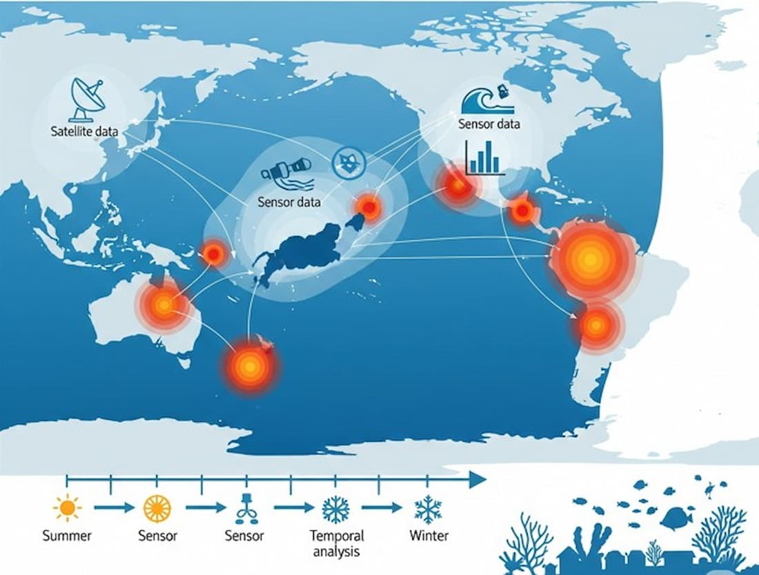 - Transnational hotspot evolution modeling: Unlike previous research examining pollution patterns within individual countries or coastal zones, our approach identifies cross-border pollution convergence zones and tracks their temporal evolution across multiple exclusive economic zones, revealing regional-scale transport pathways invisible to nation-specific studies.