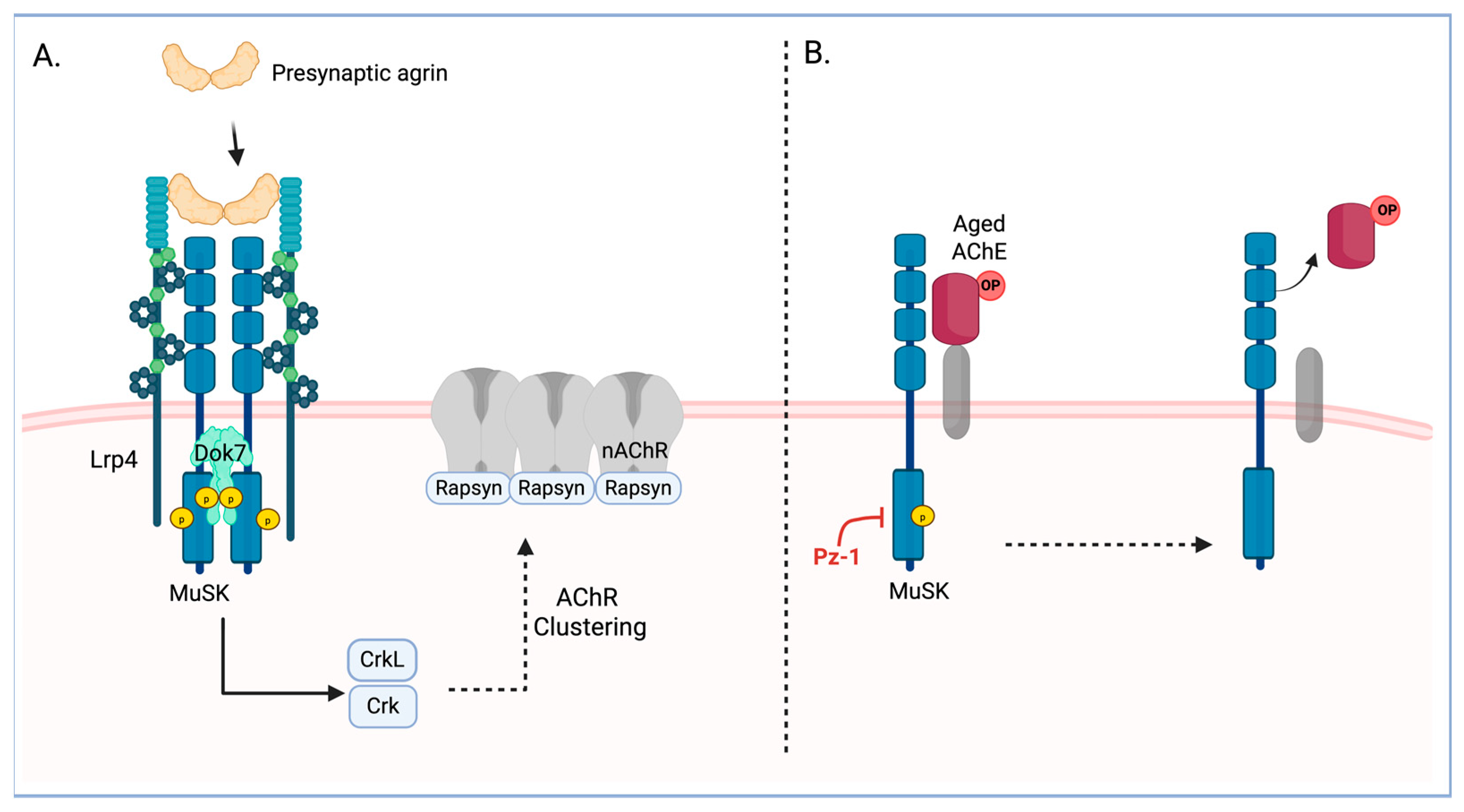 - Burden, S.J.; Yumoto, N.; Zhang, W. The role of MuSK in synapse formation and neuromuscular disease. Cold Spring Harb. Perspect. Biol. 2013, 5, a009167. [Google Scholar] [CrossRef]