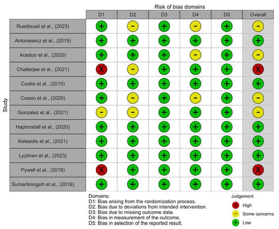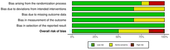 - Sterne, J.A.C.; Savovic, J.; Page, M.J.; Elbers, R.G.; Blencowe, N.S.; Boutron, I.; Cates, C.J.; Cheng, H.Y.; Corbett, M.S.; Eldridge, S.M.; et al. RoB 2: A revised tool for assessing risk of bias in randomised trials. BMJ 2019, 366, l4898. [Google Scholar] [CrossRef]