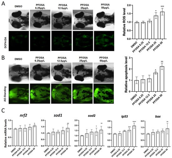 3.3. PFOSA Exposure Leads to Oxidative Stress and Apoptosis in Zebrafish Brains