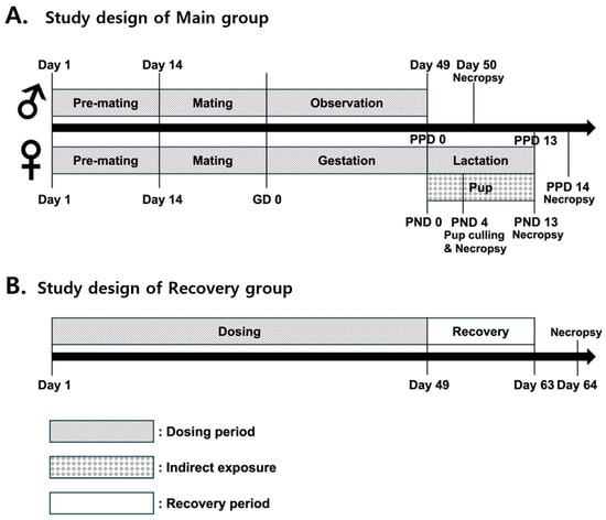 Males in the main group and females in the recovery group were administered the test substance once daily for 49 days starting 2 weeks before cohabitation and continuing until the day before necropsy. Females in the main group were administered the test substance once daily from 2 weeks before cohabitation until post-partum day 13 (PPD 13). Unmated females were administered the test substance daily for 26 days after the final day of cohabitation until the day before necropsy (Figure 1).