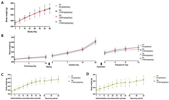 Body weight measurements of (A) males in the main group, (B) females in the main group, (C) males in the recovery group, and (D) females in the recovery group. ANOVA and Dunnett tests for (A,B). t-test for (C,D).