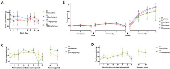 No substance-related effects on body weight were observed in males of the main group or in males and females of the recovery group. Although females in the 1000 mg/kg/day main group showed a tendency for decreased body weight during pre-mating, pregnancy, and post-mating periods, this was attributed to low body weight on day 1 and was within 10% of the control group’s change. The recovery group showed normal weight gain, suggesting the change was not substance-related (Figure 2). Similarly, food consumption showed no test substance-related effects. Temporary reductions in food consumption were noted in some groups, but these were transient, lacked dose–response relationships, and were not accompanied by body weight changes, and thus considered incidental (Figure 3).