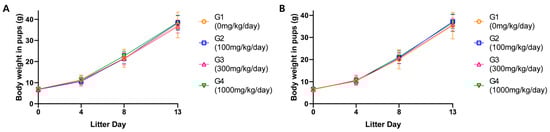 Body weight of (A) male pups and (B) female pups. ANOVA and Dunnett tests.
