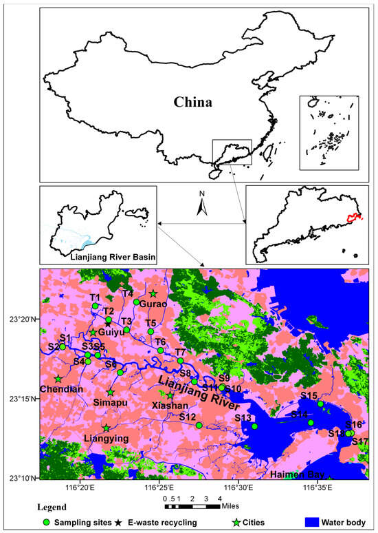 The Lianjiang River Basin (LRB), in Guangdong Province, China, possesses several large urban areas including most of Puning in Jieyang City, Chaoyang District (CYD), and the Chaonan District (CND) of Shantou City. The Lianjiang River supplies the majority of their domestic and industrial water supplies. Unfortunately, however, the water quality within the basin has deteriorated significantly as the result of the combined effects of scarce precipitation and (1) intensified human discharges of illegal and/or unregulated electronic waste (E-waste) recycling in Guiyu Town, (2) textile printing and dyeing effluent, (3) the direct discharge of domestic and agricultural sewage, and (4) the disorderly stacking of domestic garbage and industrial waste. Water quality degradation has increasingly drawn public attention, particularly because of its impacts on cities along the LRB. As a result, the LRB has consistently been a focal point of environmental research and multiple studies have shown that the mainstream of the LRB is polluted [19,20,21], as are its major tributary rivers in Guiyu Town, such as the Bergang River and Old Lianjiang River [19,21,22,23,24,25,26,27], where serious HM pollution has been identified. The primary contaminant source reported to date is associated with E-waste recycling. The importance of other sources, other areas with severe metal pollution, and HM pollution in suspended solids (SSs) in the surface water in the LRB have largely been ignored.